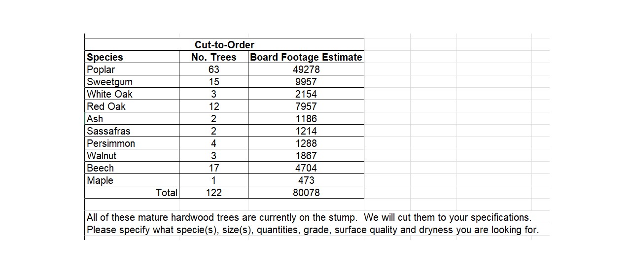 We will cut-to-Order the following standing timber to your specifications: Poplar: 49,278bf Gum: 9,957bf White Oak: 2,154bf Red Oak: 7,957bf Ash: 1,186bf Walnut: 1,867bf Beech: 4,704bf