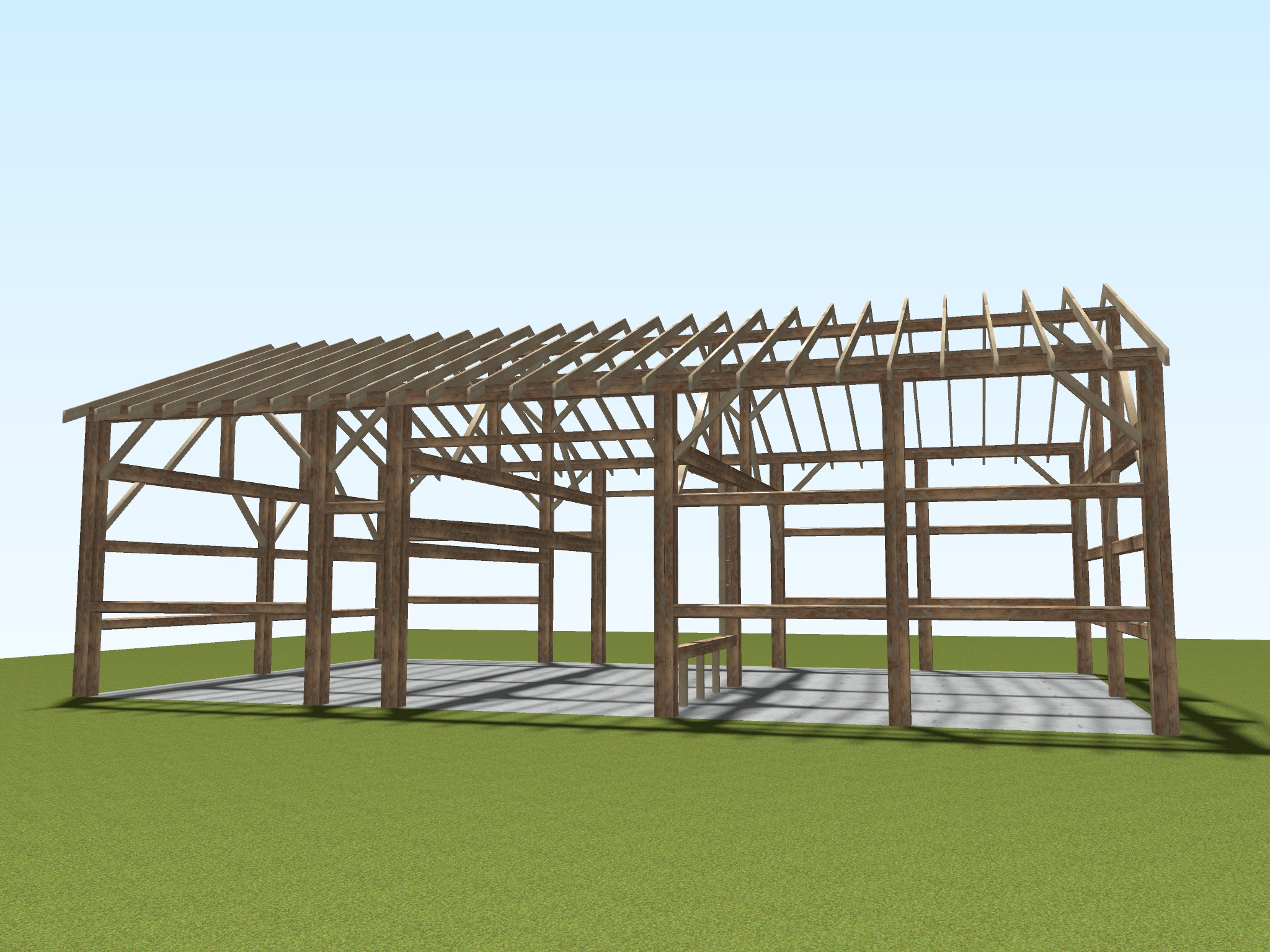 Features: • Hand Hewn Timbers • 14'-6" floor to top of eave beam 10x10 Posts and Main Cross Ties • Half round 4x5 girts • 10"x14"x30' Swell Beam spans entire 3rd Bent • 5/12 Roof Pitch • Only one post in main floor area of frame, allowing greater design possibilities