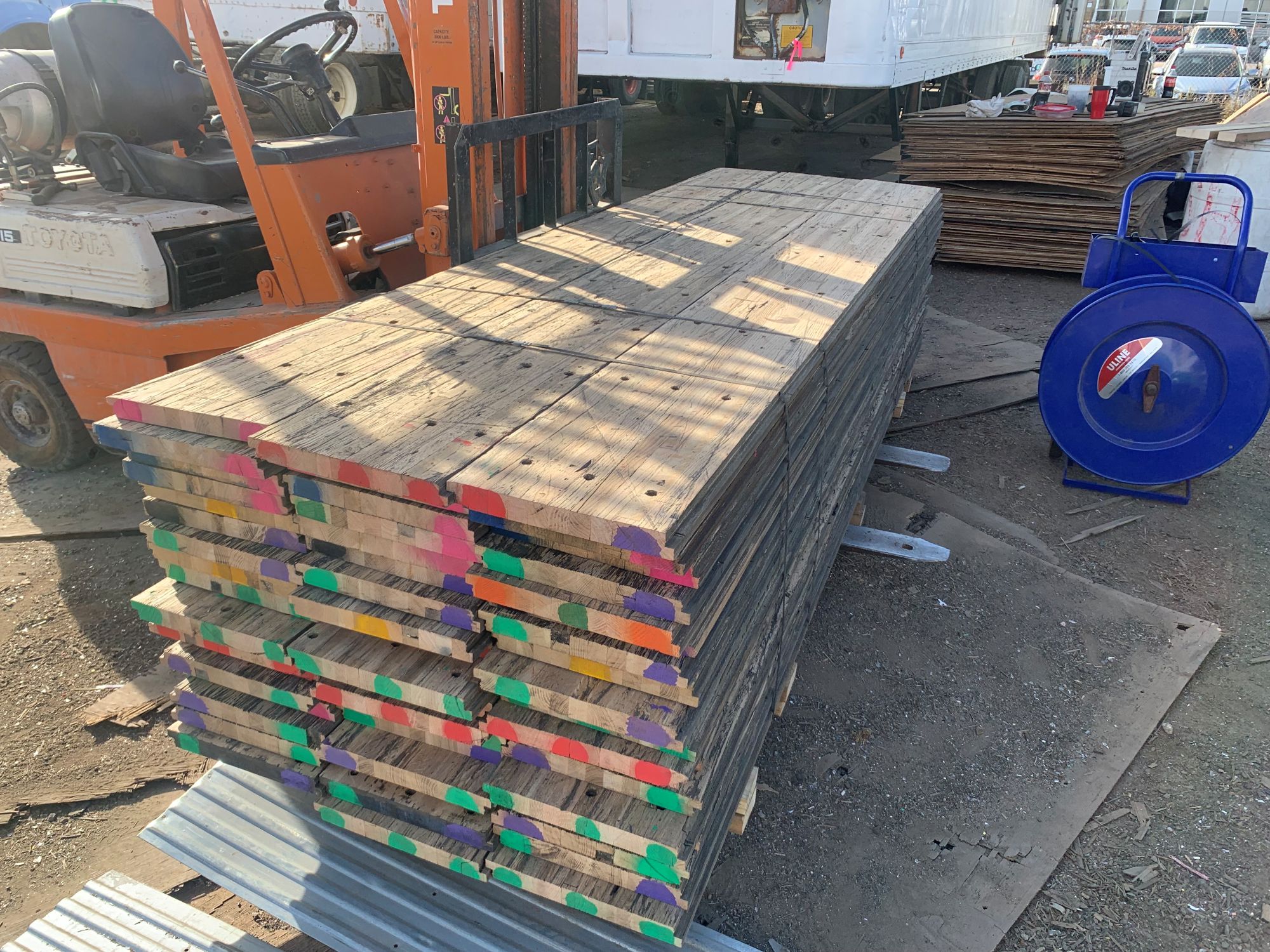 We have over 30,000 bf of reclaimed oak cargo planks (semi trailer flooring) in stock. Planks are 1 3/8’ thick 12” wide and various lengths. Mostly 8’, 10’, and 12’ lengths. Cargo planks are rough sanded on top surface to 80 grit. All hardware (T-40) bolts used to secure to frame of trailer included in order.